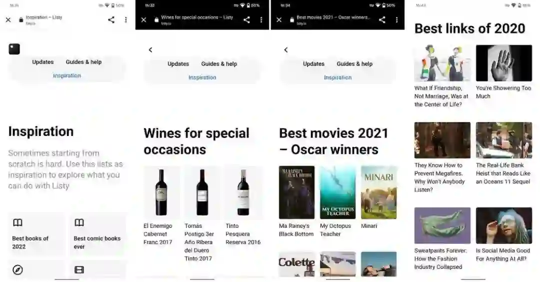如果你不确定想要如何建立清单,Listy 甚至内置了一个教程并将其以网页形式呈现,你可以点击查看使用 Listy 能制作出的清单效果,相比于只能呈现纯文字的清单工具,Listy 制作的清单就显得图文并茂、更加美观。