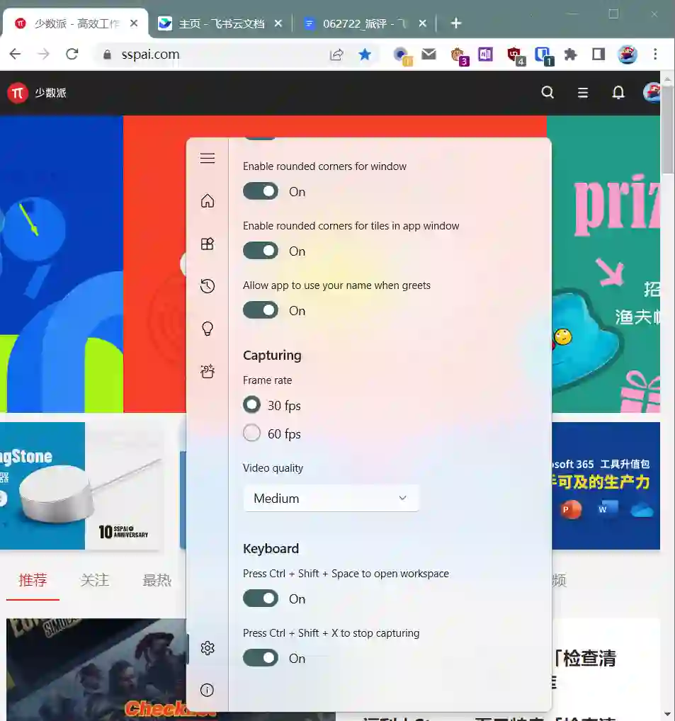 想要添加快捷方式,只需要在侧边栏切换到「All apps」标签并「pin」一下就好。需要注意的是,这里默认只展示 UWP 应用,你可以点击加号来添加其他软件工具。主页下方则是一些系统内建操作的快捷方式,比如我就最喜欢 emoji 键盘这个快捷操作,因为在没有外接键盘使用电脑时,虚拟键盘查找 emoji 表情也要点击好多次。设置中还可以对一些快捷操作进行自定义,例如录制窗口的帧率等等。