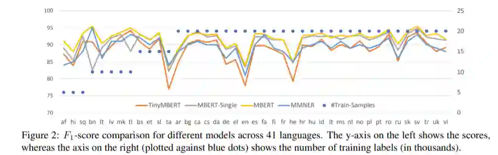 深度和大型的预训练语言模型是各种自然语言处理任务的最新技术。然而,这些模型的巨大尺寸可能会阻碍在实践中使用它们。最近的一些并行工作使用知识蒸馏来将这些庞大的模型压缩成小型模型。在这项工作中,我们以多语言命名实体识别(NER)为重点来研究知识蒸馏。特别地,我们研究了几种提炼策略,并提出了一种利用教师内部表征的阶段性优化方案,该方案不考虑教师体系结构,并证明其优于以往工作中所采用的策略。此外,我们还研究了几个因素的作用,比如未标记数据的数量、注释资源、模型架构和推理延迟等等。我们证明,我们的方法可以将类mbert教师模型的参数压缩高达35倍,批量推理的延迟压缩51倍,而NER超过41种语言的95%的f1分都保留下来。