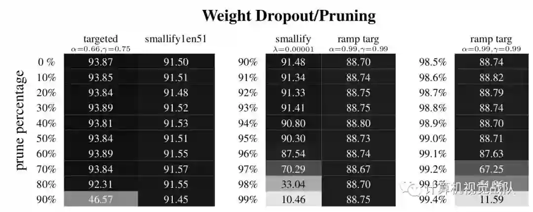 实验在CIFAR-10上使用ResNet-32。其中左图为三次targeted中最好的结果与 6次smallify中最好结果的对比,中间图为检测出最高的剪枝率,右图为ramping Tageted Dropout检测出的更高剪枝率。