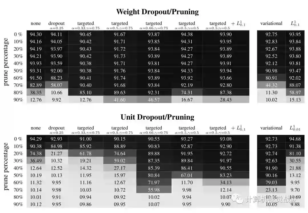 注:上表展示了Weight Dropout策略的结果,下表展示了Unit Dropout的结果。
