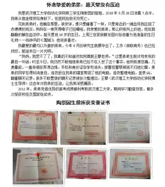 武汉理工大自动化学院研三学生陶崇园跳楼自杀——牵动了无数研究生和导师群体,特别是自动化和人工智能相关技术领域的人。无论事情的真相如何?我相信陶崇园事件不是个例,只是浮出水面的极端表现,还有更多的研究生正在被导师进行经济上压榨,体力上剥削,精神上的虐待!希望每一位善良的读者,老师,学生和家长都一起呼吁——帮助那些还在被“虐待和压迫”的学生!——导师(老板),请让我活着毕业!