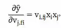 在FFM中,每一维特征 x_i,针对每一种field( fj)的特征,都会学习一个隐向量 v_{i,fj}。因此,隐向量不仅与特征相关,也与field相关。与FM模型类似,FFM模型方程定义为(为了计算简便只有交叉项):