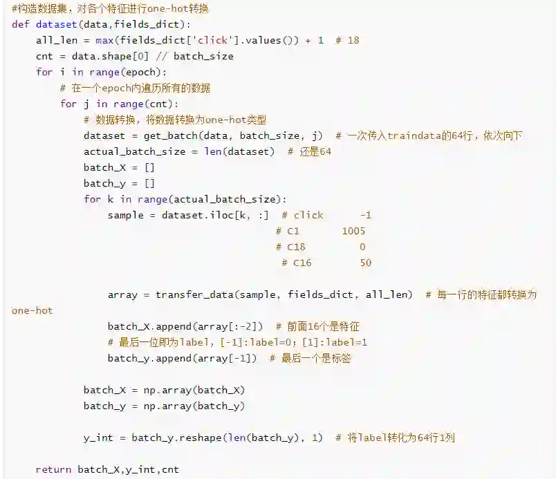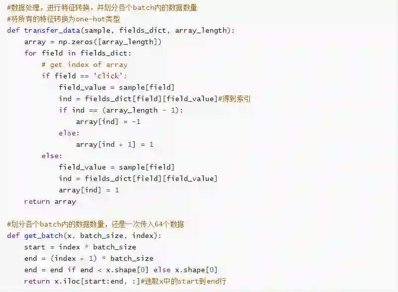 原始输入数据以点击率预测为例,共有16个特征,三个fields。数据处理主要包括特征提取、field划分以及将数据转化为one-hot类型这三部分内容。