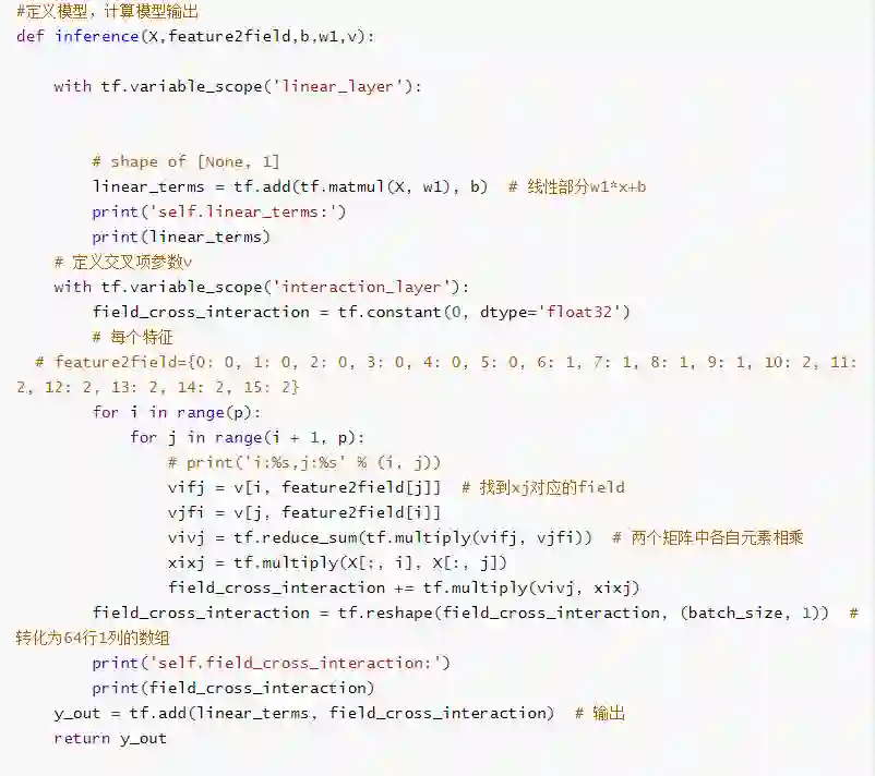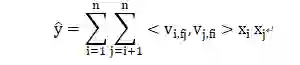 FFM是FM的变体,在开始介绍FFM之前,我们一起回顾一下FM的基本原理,FM使用分解参数对变量之间的所有交互进行建模,学习每个特征学习隐层向量,其输出公式如下: