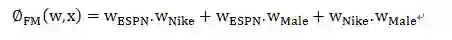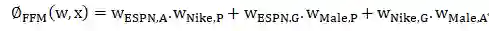 w_ESPN用于了解耐克(w_ESPN·w_Nike)和男性(w-ESPN·w-Male)的潜在影响。然而,由于Nike和Male属于不同的领域,(EPSN,Nike)和(EPSN,Male)的潜在影响可能不同。而对于FFM,每个特征都有几个潜在的向量。