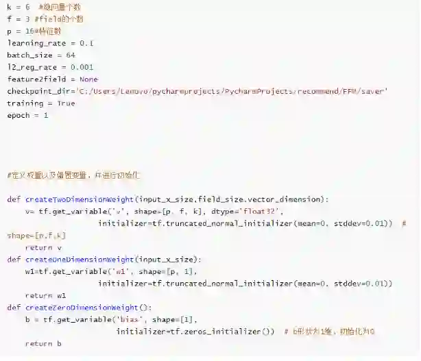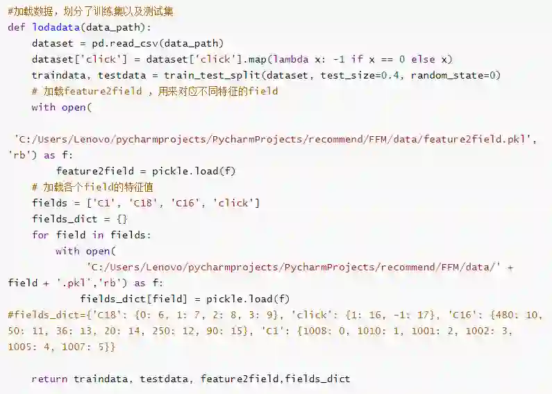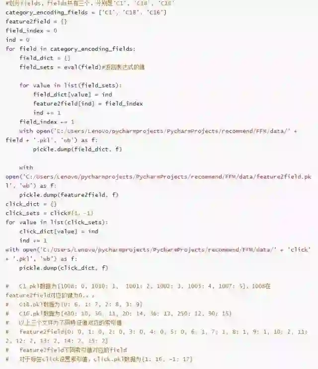 根据每一个特征所属的field,构造字典。例如在feature2field={0: 0, 1: 0, 2: 0, 3: 0, ...}中, value为field,key为变量名的映射;在C1.pkl={1008: 0, 1010: 1, 1001: 2, 1002: 3,....}中,key为变量值,value为变量名的映射。这样就可以通过变量名映射找到各变量值所属的field。