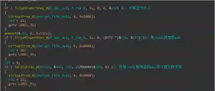 由于在以上这些系统中,生成的密钥对和密钥容器都会被存储在内存中。所以勒索病毒会额外清空一下内存中的密钥容器内容和密钥对,避免在内存中找到密钥对从而恢复被加密的文件。