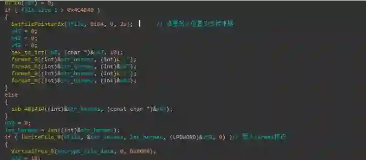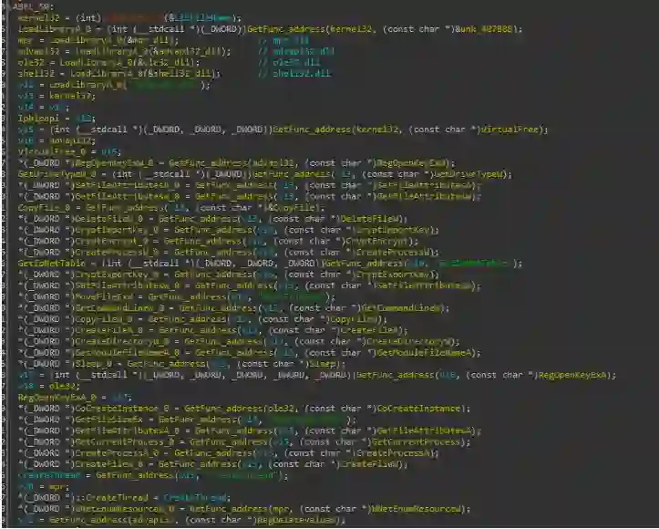 若磁盘空间充足,则会通过动态获取的方法加载后续操作所需要的函数,以此来躲避杀毒软件的静态查杀。下图仅列出一部分