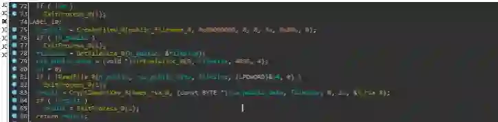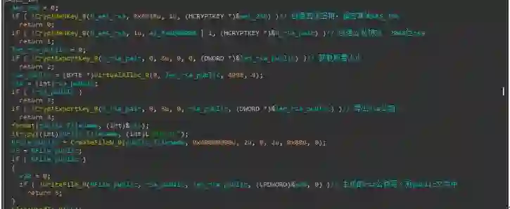 完成后,病毒会将刚刚生成的PUBLIC文件中的RSA公钥读取出来,在稍后进行的文件加密操作中,用于对加密密钥的再加密工作。