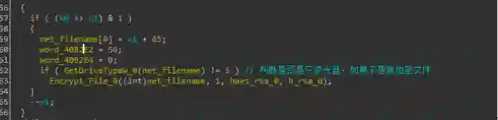 病毒遍历文件的过程中,还会判断当前盘符挂载的是否是只读光盘,若是,则不在对该磁盘进行加密操作。