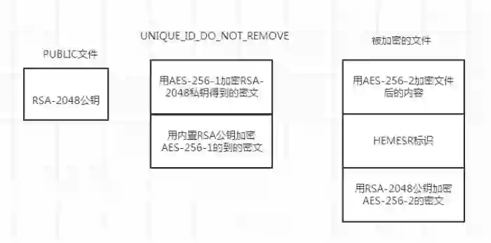 最后,病毒将AES密钥用PUBLIC中的RSA公钥加密,再将加密后的AES密钥写入到文件尾部。