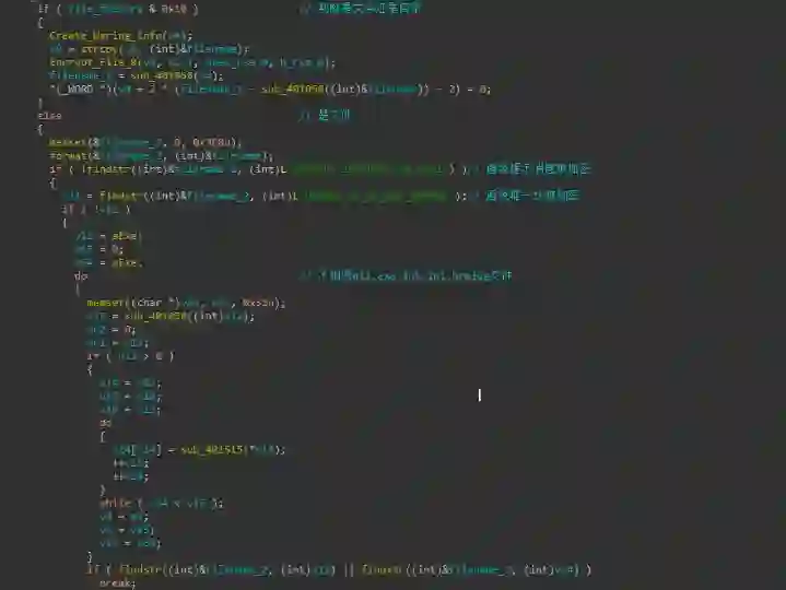 接下来,病毒会先判断正在扫描的目标是文件还是目录:若是一个目录就生成敲诈信,并进入该目录继续做递归扫描工作。若不是目录,再判断该文件是否是生成的敲诈信息或生成的唯一ID,均不是则继续检查文件的扩展名,若不是dll、exe、ini、lnk、hrmlog中的一个才会进行加密工作。