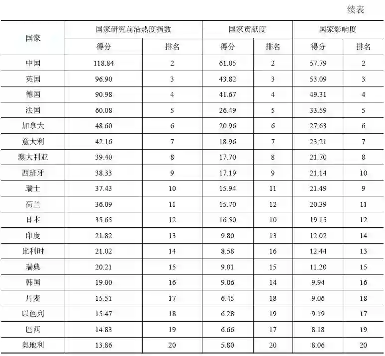 国家研究前沿热度指数由国家贡献度和国家影响度组成,从表12.1 可以看出三个指标前8 名的国家完全重合,且位次完全一致。第9~20 名的国家三个指标也基本重合,只是位次略有不同。