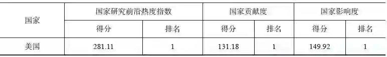 在十领域综合层面,美国表现突出,研究前沿热度指数得分为281.11分,位居全球首位。中国以118.84 分位居第2。