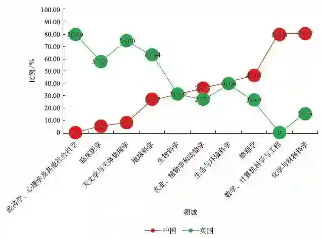 从图3 可以看出,中国和英国在优势领域和劣势领域完全相反,形成了此消彼长的“剪刀差”现象,中国在化学与材料科学领域,以及数学、计算机科学与工程领域表现最活跃,而英国在这两个领域则表现一般。而临床医学领域、天文学与天体物理学领域和经济学、心理学及其他社会科学领域等3 个领域,英国表现比较活跃,而中国在这3 个领域则表现不够活跃。地球科学领域也是英国表现活跃的优势领域,而中国则表现一般。其他4 个领域包括生物科学领域,农业、植物学和动物学领域,生态与环境科学领域和物理学领域,中国和英国相差不大。