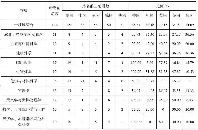 分领域来看,美国在8 个领域排名前三的前沿占比均在70%~100%,在化学与材料科学领域也占到了约65.38%,在数学、计算机科学与工程领域排名前三的前沿比例最低,为50.00%。