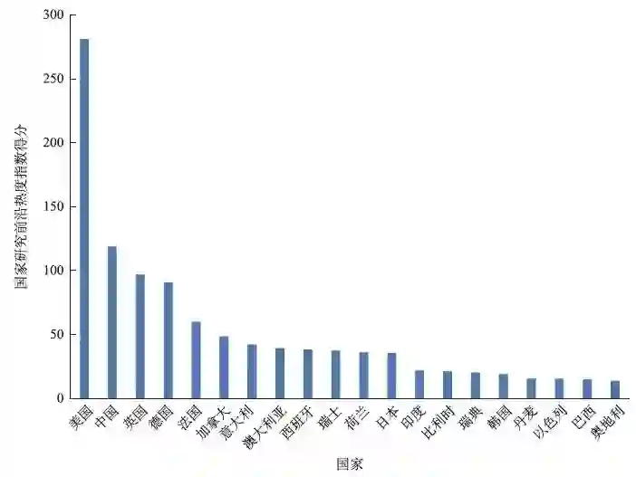 ②特定领域分析:对于一个研究领域,分别对所有参与国家在领域内所有研究前沿的国家研究前沿热度指数得分进行加和,得到各国在特定领域的国家研究前沿热度指数,并进行排名和对比分析。