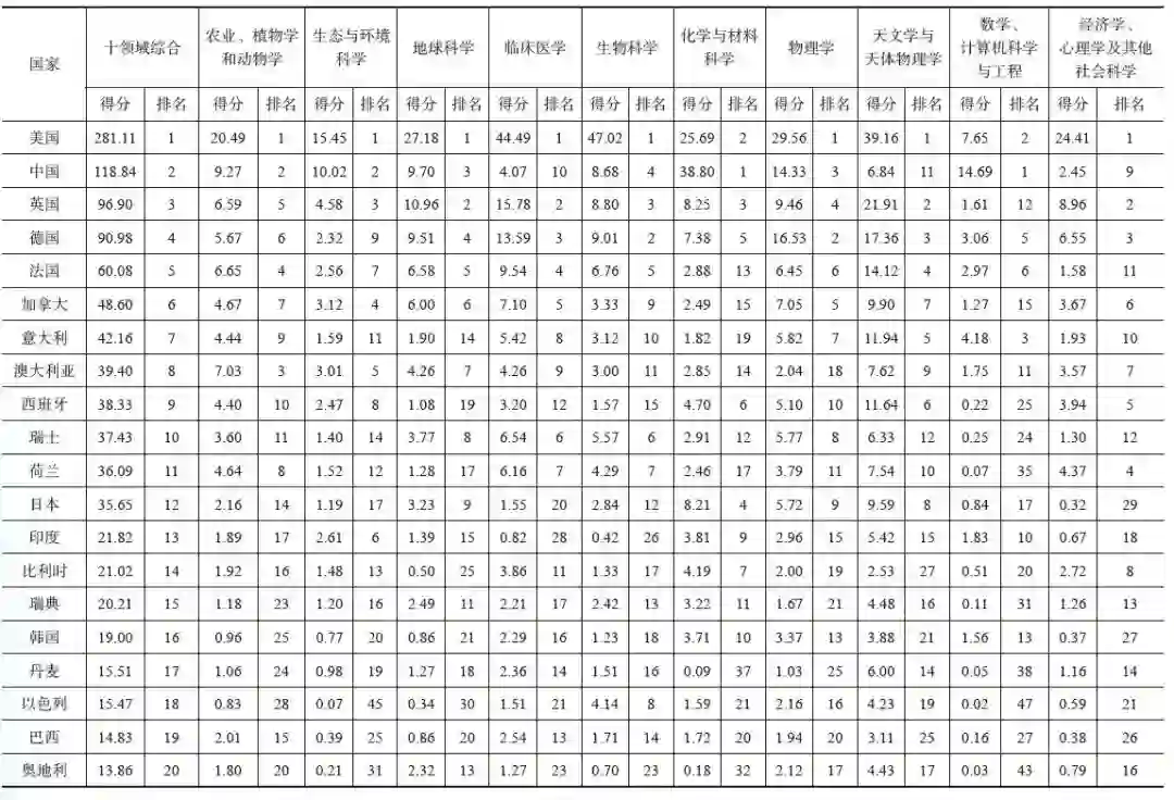 综合十大领域,公布各国研究前沿热度指数得分和排名,从而揭示各国领先研究前沿的领域结构特征。