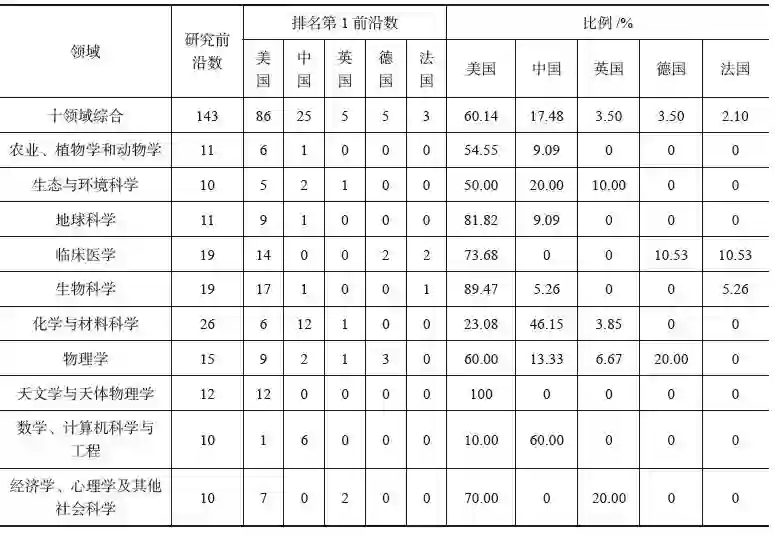 10 个领域中,美国排名第1 前沿数较少的领域是化学与材料科学领域,以及数学、计算机科学与工程领域,这两个领域仅有23.08% 和10.00% 的前沿排名第1。而其他领域美国至少有50% 及以上的前沿排名第1,例如生态与环境科学领域10 个前沿中有5 个排名第1,而在天文学与天体物理学领域,美国则包揽了所有的12 个前沿的第1 名。