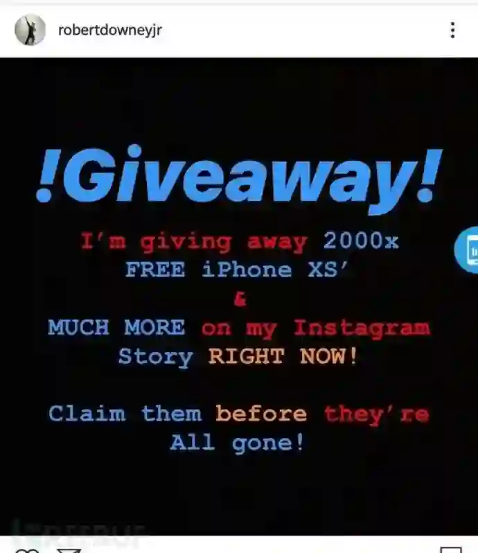目前还不清楚黑客如何入侵Robert Downey Jr.的Instagram,黑客只是在他的账号上发布消息说,Robert Downey Jr.将赠送2000部iPhone XS设备,并吸引粉丝进入他的账号主页,以获得更多这样的优惠。