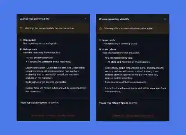 的确,GitHub在这时候会弹出确认窗口。这个功能的设计本意确实是让Jakub Roztočil这种状况中的用户别做傻事、点击错误选项。它的文本内容会告诉你「将永久失去所有的项目评星和所有本托管项目的关注者」。