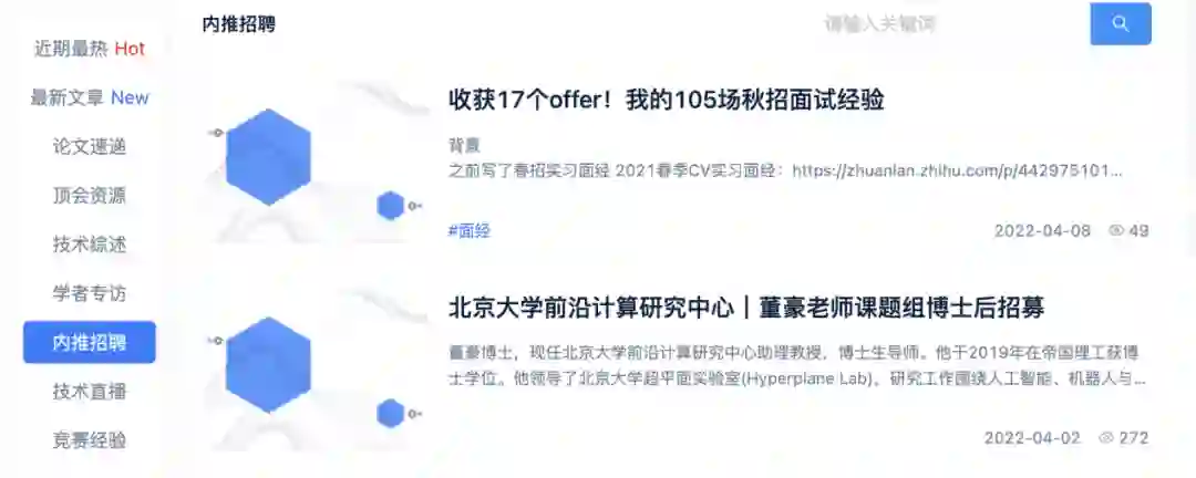 除了丰富的理论知识和实践经验,极市社区还有“内推招聘”内容模块,不仅涵盖多个细分方向的面试面经,同时还有最新的算法岗位内推,帮助你迅速变成offer收割机: