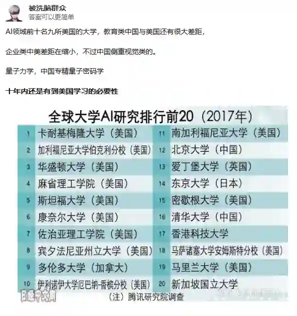 根据知乎网友@被洗脑的群众,AI领域前十名其中九所美国的大学,教育类与美国还有很大的差距,对于量子力学,中国专精量子密码学,所以,在十年内还是有到美国学习的必要性。
