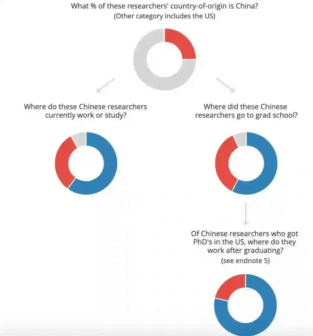 另外,保尔森研究所宏观政策智库研究员曾经根据顶级AI年度会议上发表的论文对中美AI科研人员进行了研究,他发现在中国国籍的高级研究人员中,大多数(59%)隶属于美国研究机构,33%隶属于中国研究机构,约9%隶属于加拿大、新加坡和日本等其他国家。