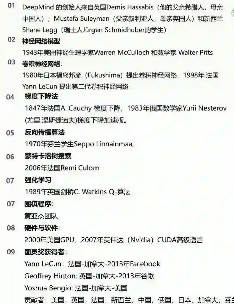 综上 Alpha Go 的贡献者有九个到十个国家,有美国、英国、法国、新西兰、中国、俄国、日本、加拿大、芬兰。这说明任何一个科学成就,都是全世界科技工作者共同努力的结果,特别是前人大量基础研究的积累。