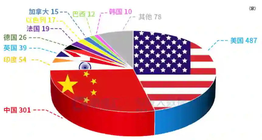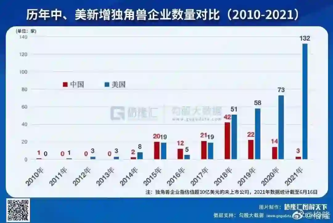 按照经济数据可视化媒体格隆汇2022年1月出的上年总结,在可以反映经济创新与前进势头的独角兽企业数据上,2021年美国以487家排名世界第一,比2020年增加254家,中国以301家排名世界第二,比2020年增加74家,其中有8家独角兽估值超千亿元。