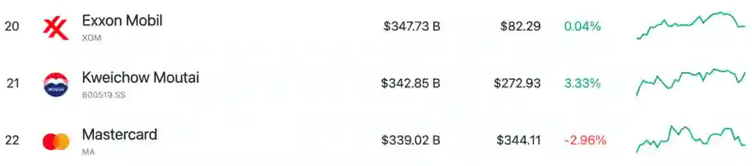 这个列表里,茅台也以3423.1亿美元的市值位列世界第21强,低于埃克森美孚,但高于运通卡公司。