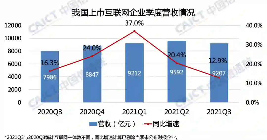 2021Q3上市互联网企业总营收达9207亿元,同比增速为12.9%,较2021年同期下降3.4百分点
