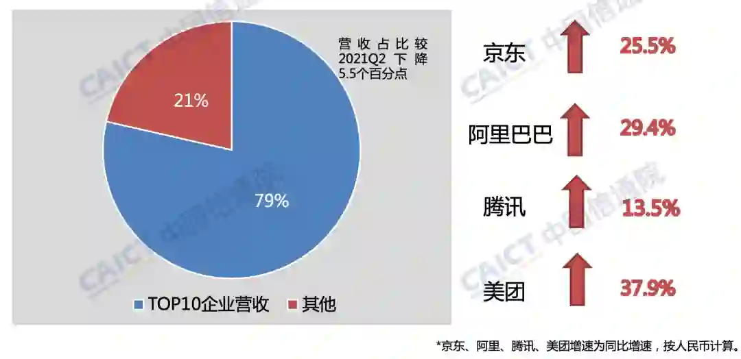 2021年底,中国Top10上市互联网企业营收占比为78.5%,营收增速为25%,高于上市互联网企业总营收增速。