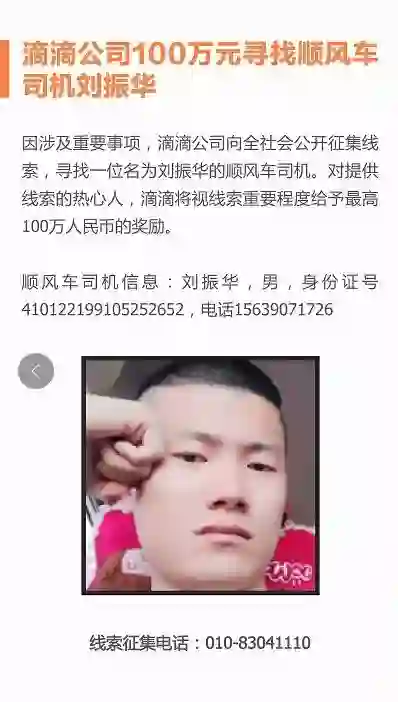 顺风车司机信息:刘振华,男,身份证号:410122199105252652,电话:15639071726,线索征集电话:010-83041110。
