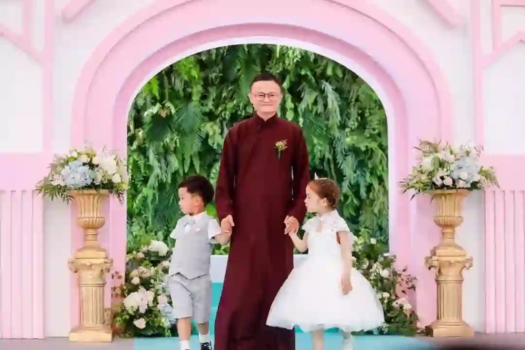 在婚礼仪式现场,马云带着圆框眼镜,牵着两位花童出现,为阿里新人们的集体婚礼进行证婚,并送上证婚词,希望“大家努力做好好老公、好老婆”,同时笑称自己的证婚年限是80年,80年以后可以离婚,80年以内不能轻易离婚。
