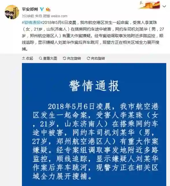 昨日晚间,据@平安郑州 微博 :2018年5月6日凌晨,21岁李某珠在搭乘网约车途中被害,网约车司机刘某华(男,27岁,郑州航空港区人)有重大作案嫌疑。经专案组调取事发地附近多路监控,顺线追踪,显示嫌疑人作案后弃车跳河,现警方正在相关区域全力搜捕。