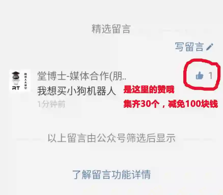 机器人大讲堂为了回馈广大粉丝对大讲堂的厚爱,我们也有相应的减免活动。只要您将这篇文章转发到朋友圈,并在文章底部留言(我想买XXX机器人),并集齐30个赞,去微店购买以下商品,我们都会主动联系您,为您返还100元现金哦。