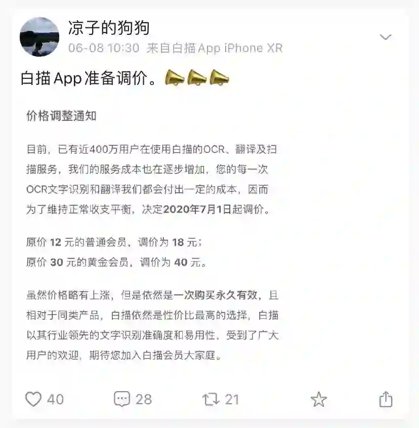 白描的开发者先前在微博上表示,白描的会员价将会从 7 月 1 日起提升至黄金会员 40 元、普通会员 18 元,少数派届时也将进行不同幅度的调价。如果你还没入手白描,不妨抓紧这次机会。