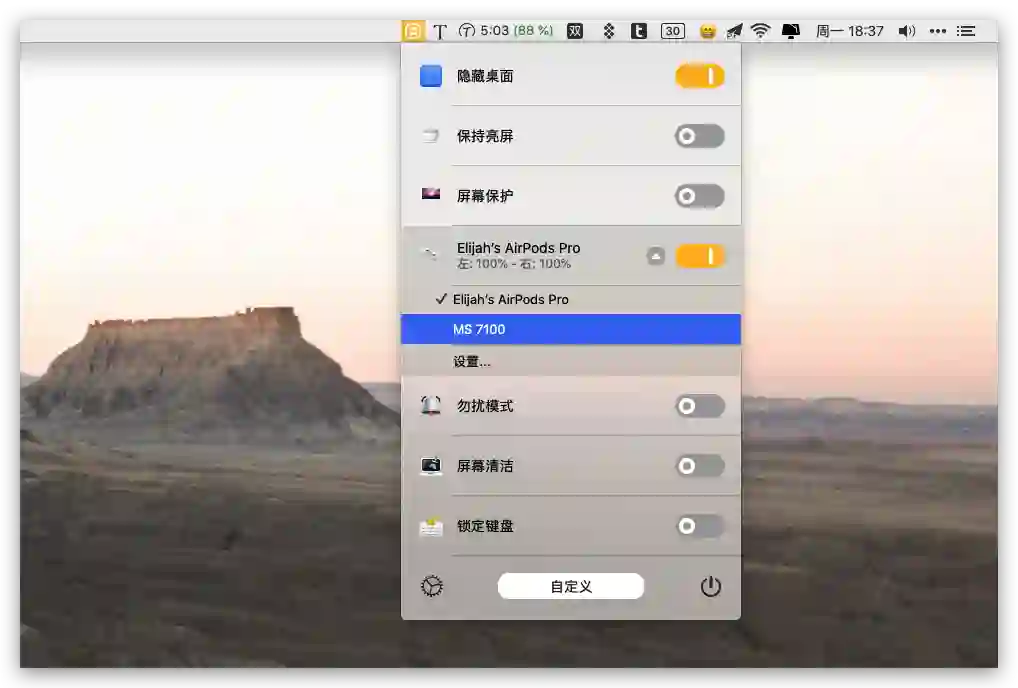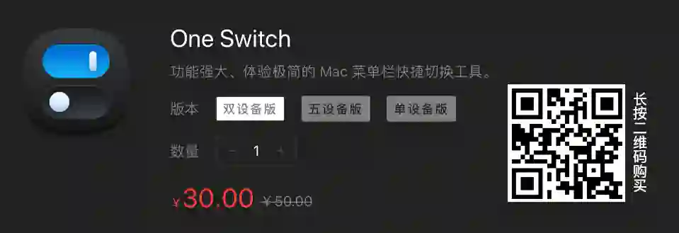 One Switch 是 macOS 上的一个「万能开关」。它会常驻在你的菜单栏中,你只需要点击几下,就能做到切换蓝牙耳机,打开或关闭相应的系统功能等动作,不再需要到「系统偏好设置」里东翻西找。