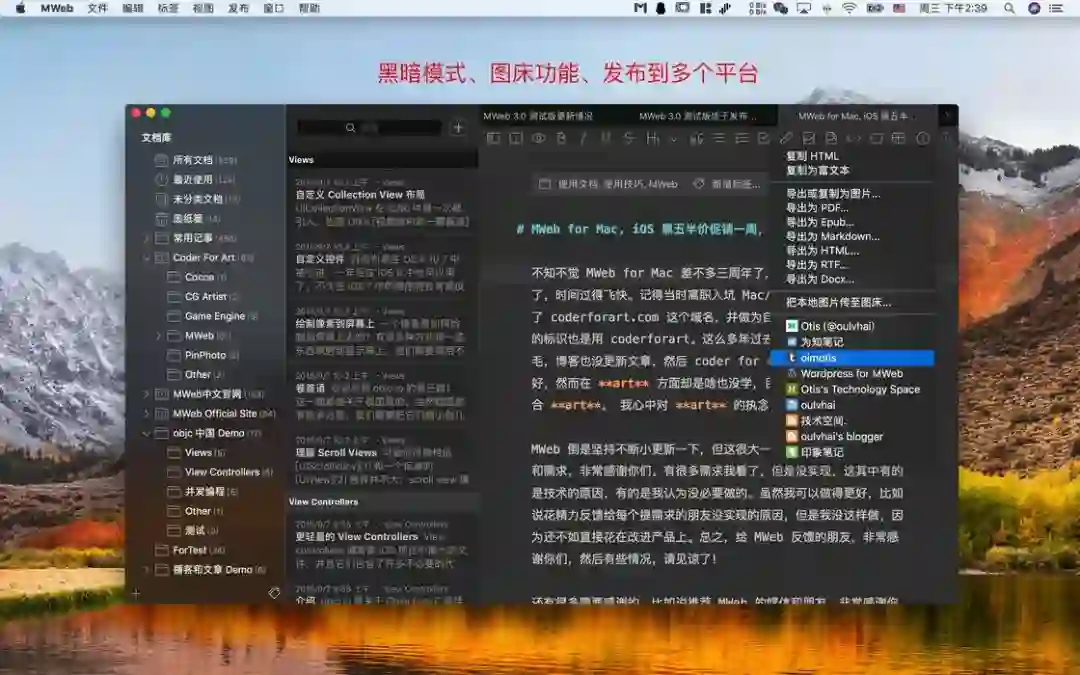 MWeb 是一款全能型 Markdown 编辑器,你可以在应用内直接生成并发布文章 WordPress、Medium 等平台,并借助 GitHub 等平台托管图片资源。不仅如此,它还支持菜单栏快捷笔记、文档快速搜索等功能,助你在写作上「快人一步」。