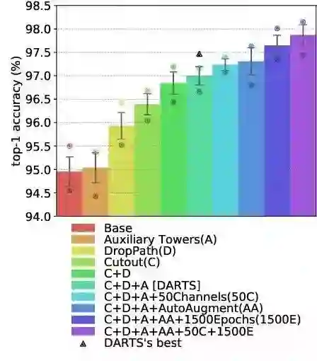 Auxiliary Towers、DropPath、Cutout、AutoAugment 、训练延长到1500 epochs、增加 channel 的数量。