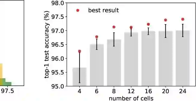 此外,如下图所示,作者发现网络结构里面 cells 的数量对于最终的准确率影响很大,而cells又是个人工挑选的超参数。