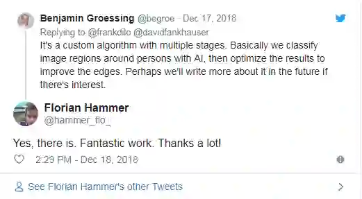 不过 Benjamin Groessing 也在个人推特上强调了,remove.bg 目前只能针对含有人像的照片,其他更复杂的主体识别功能,未来将根据用户的反馈持续完善。
