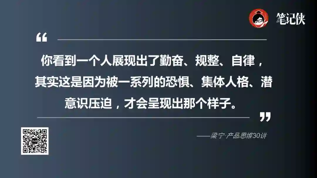 为什么?因为自我实现其实是一条漫长而痛苦的路,人的本性是懒惰的。你看到一个人展现出了勤奋、规整、自律,其实这是因为被一系列的恐惧、集体人格、潜意识压迫,才会呈现出那个样子。