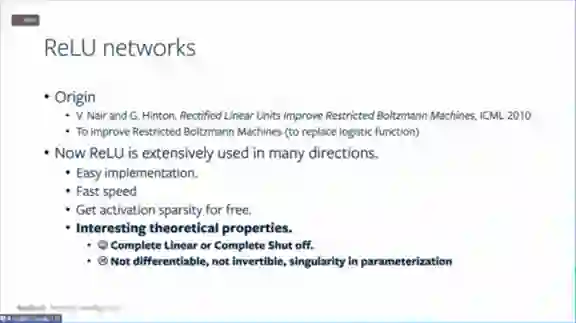 今天我们讨论ReLU 网络,ReLU激活函数在神经网络的应用非常广泛。因为它很容易实现,而且学习比较快,能自然地实现网络稀疏性。除此之外,它还有一些非常有趣的理论性质,并且它的函数性质对理论分析来说有好处。当然,它也有不足的地方,比如说不可微的、不可逆,存在参数化奇点等。