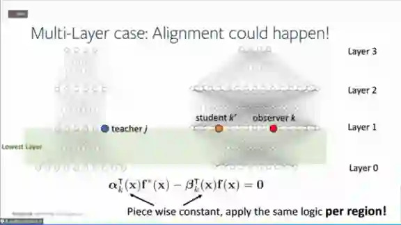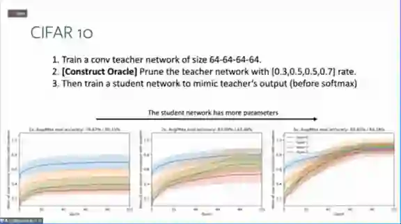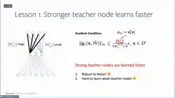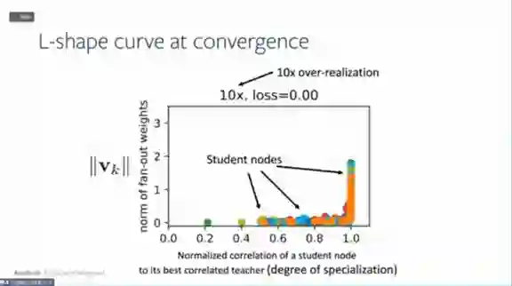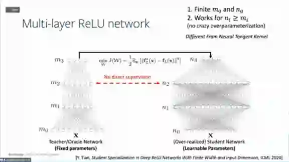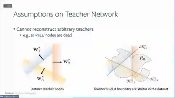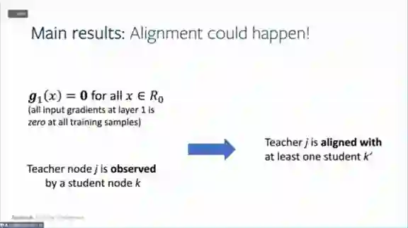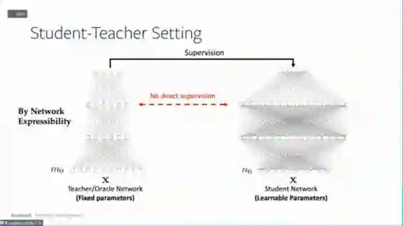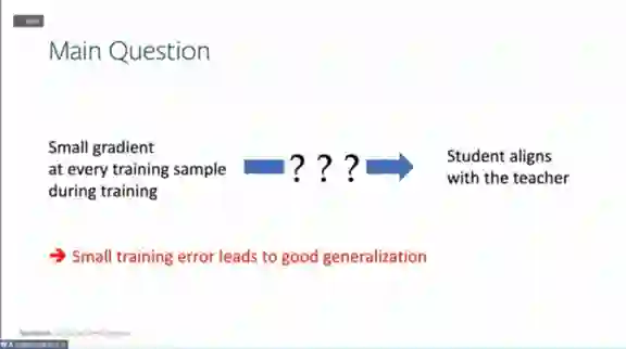。假设总有教师神经网络能够完全拟合所有数据,然后用学生神经网络去学习教师神经网络,就可以拥有参考点,这个参考点可以用来做细致的优化分析。以前只能通过损失函数来学习,现在可以通过学生网络和教师网络之间的权重对应关系来进行。