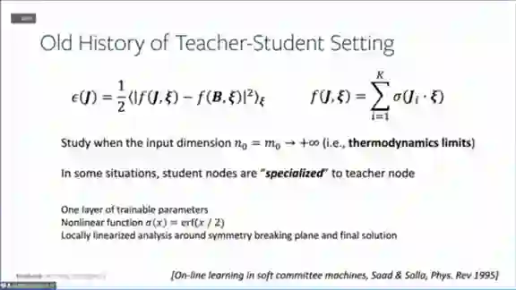 学生-教师设置在1995年就已经有物理学家提出来,当时使用的是两层神经网络,并且没有使用ReLU函数,此外他们还假设,输入样本的维度必须是无穷大的。