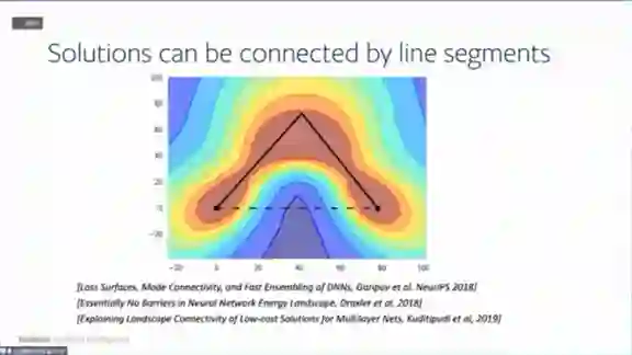 同样的思路可以用来解释神经网络的一些非常奇怪的现象,比如说将神经网络训练到两个局部最小值,这两个解如果用折线(而不是直线)连起来,可以保证折线上的每个解的错误率都比较小,这跟凸优化的情况很不一样。