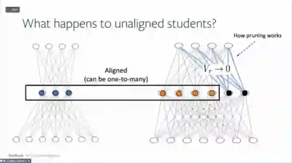 可以证明在满足某些条件时,那些没有对齐的学生网络节点(下图的黑色点),它的输出权重会是0,这就给我们提供了如何对神经网络进行剪枝的理论基础。